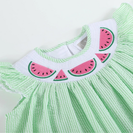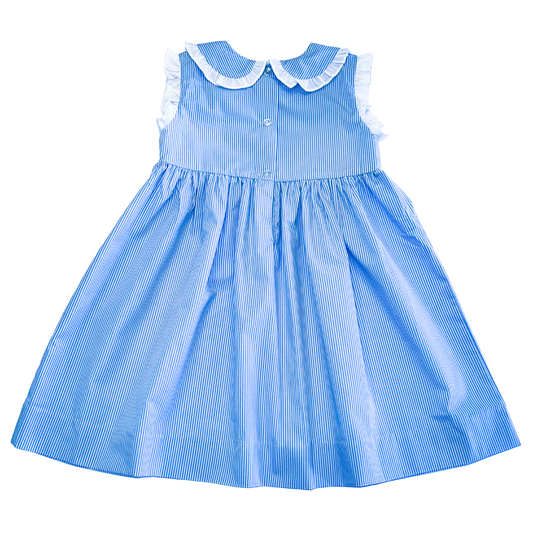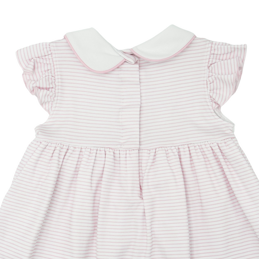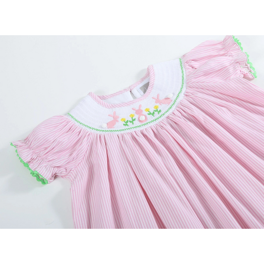 Pink Pinstripe Pom Pom Bunny Smocked Bishop Dress