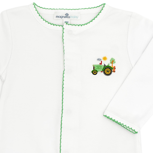 Tractor Time Green Embroidered Footie