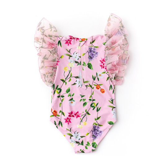 Wildflower Vine Swimsuit with Tulle Sleeves