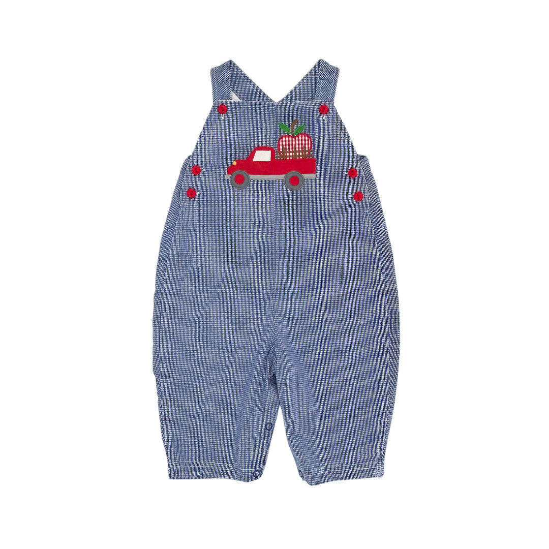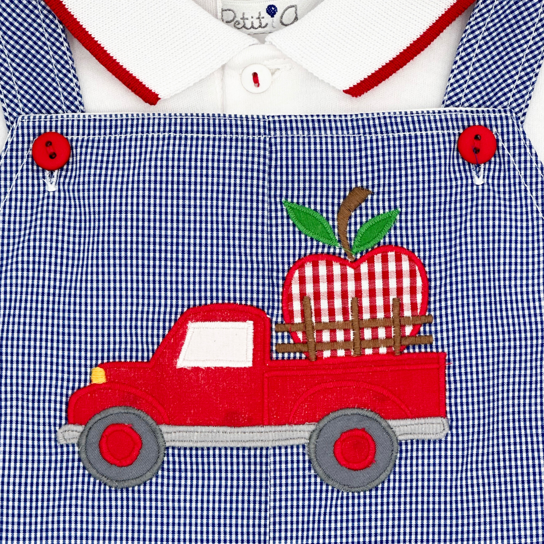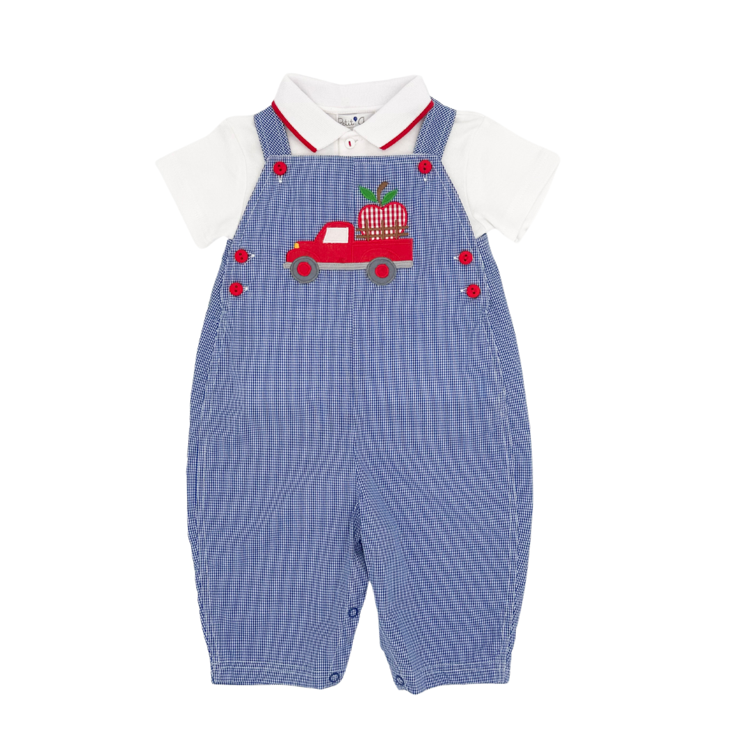 Your little guy will be set for back to school and fall apple picking adventures in this set! The longall features a royal blue check fabric and a darling truck and apple applique. A coordinating white short sleeve white polo shirt completes the set.
