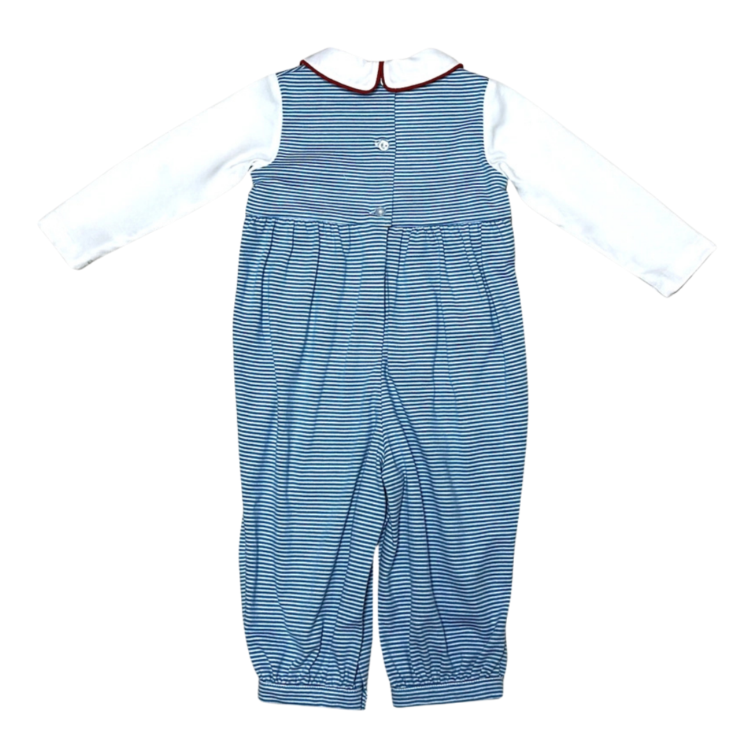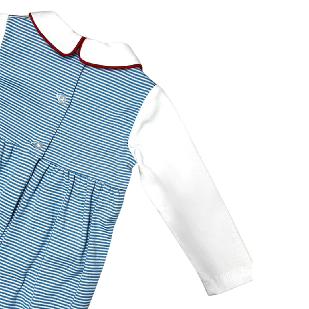This darling blue and white longall is made of 100% cotton and features red trim and an applique of a construction vehicle.Β