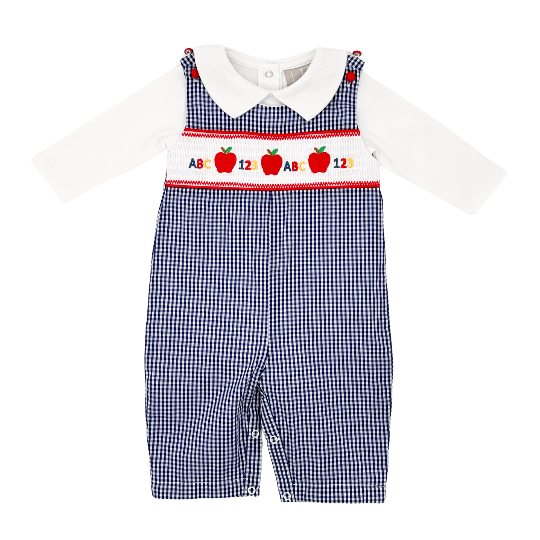 New school year? No problem! Send your little one back to school in these adorable smocked overalls! The blue and white gingham overalls feature smocking with embroidered apples, letters and numbers, as well as red buttons at the shoulders. Snap closures along the bottom allow for quick diaper changes. Your little one will go to the head of the class in these overalls!