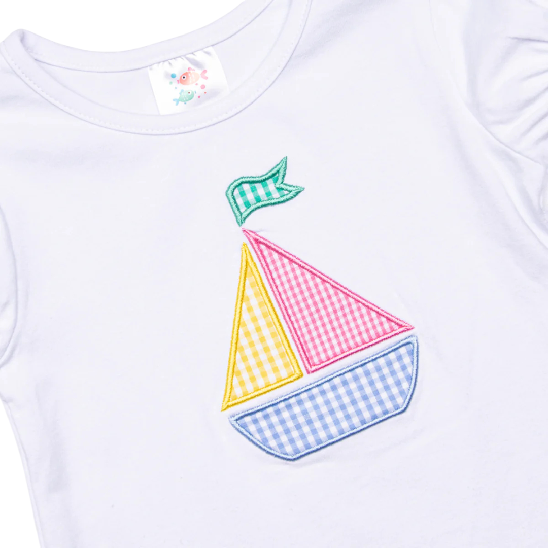 Nothing but blue skies ahead! This set features a white knit top with short puff sleeves and a gingham sailboat applique. Coordinating pink and white gingham shorts complete the set. Your little one will sail away the summer days in this outfit!