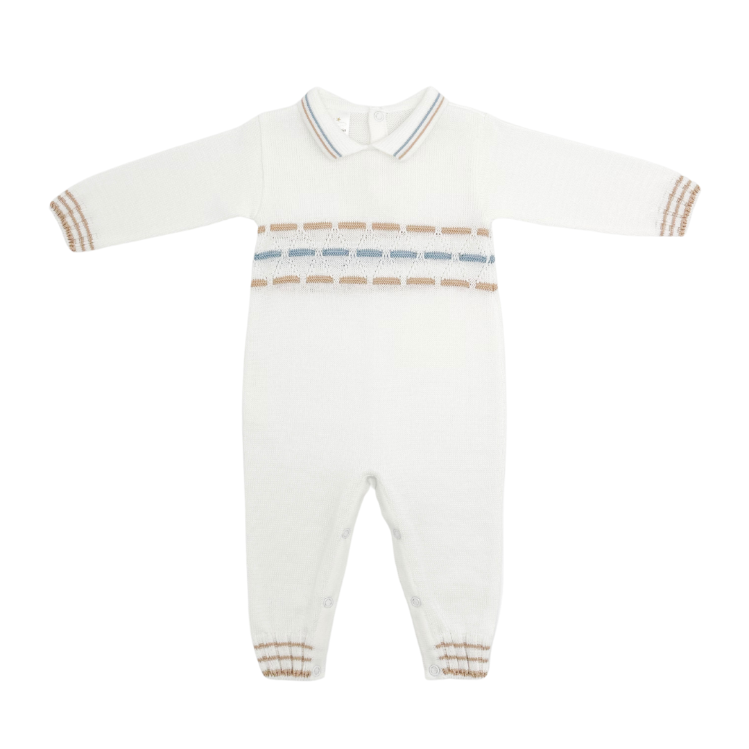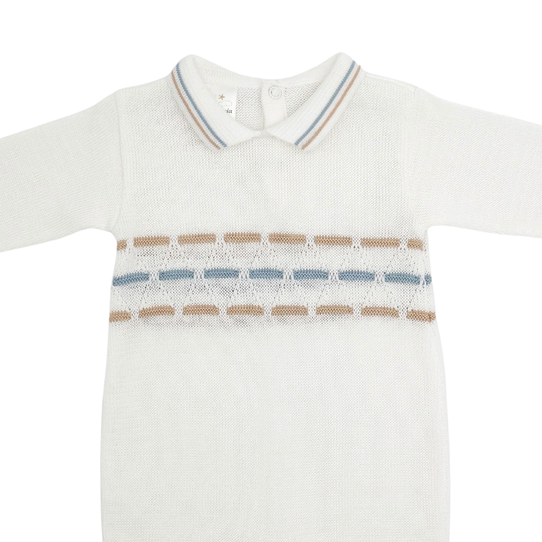 Keep your baby warm this winter in this sweet knit jumpsuit! The creamy white color is accented by touches of blue and tan, and snaps make for easy diaper changes.