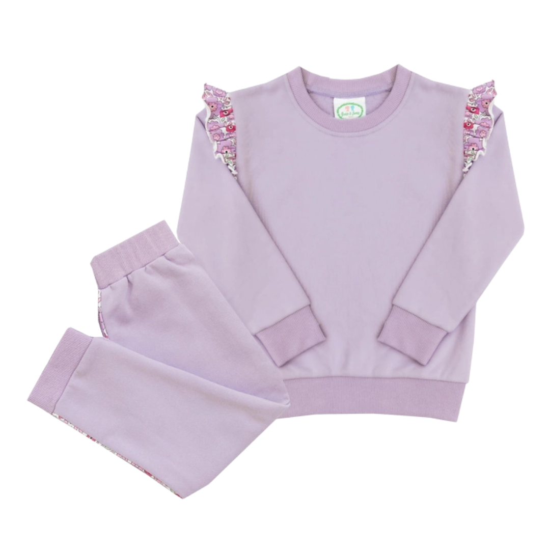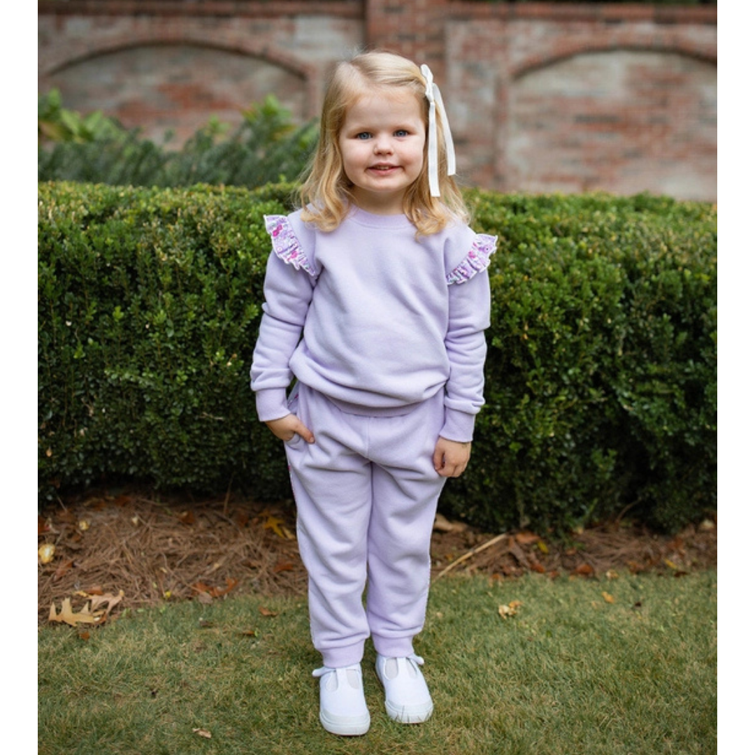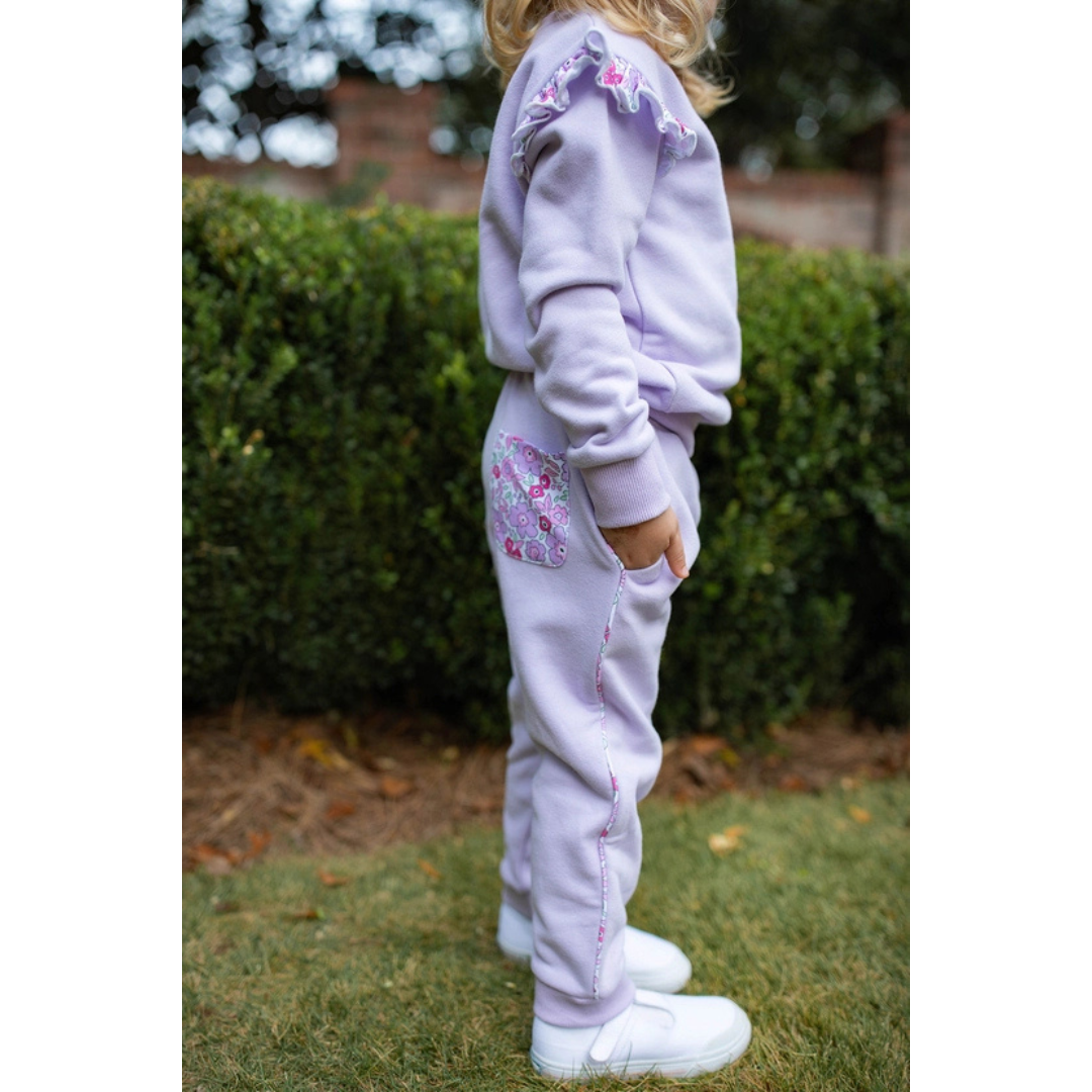 Your little girl will delight in this adorable jogger set! The lavender set features retro floral trim in vibrant shade of purple. Comfort and style rolled into one!