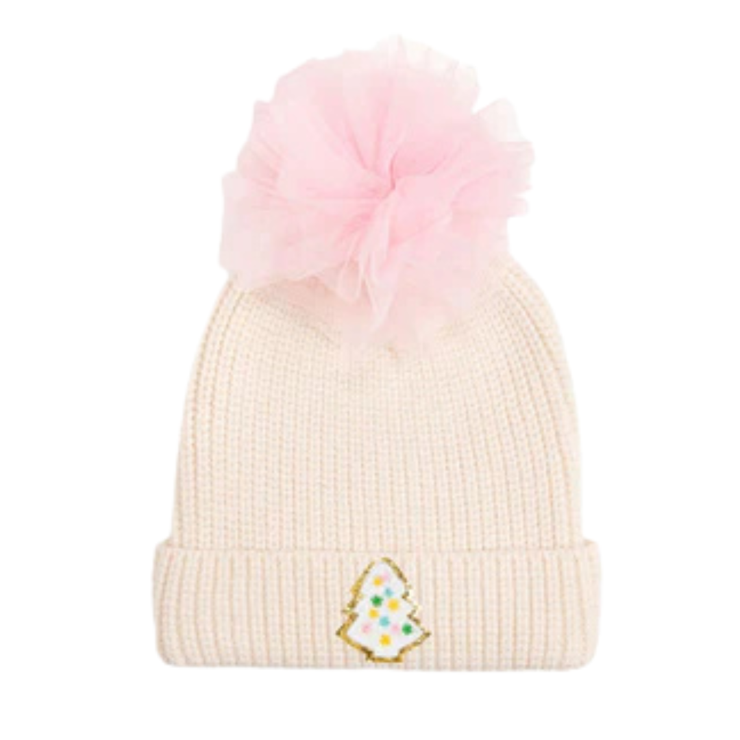The Pastel Christmas Tree Patch Pom Pom Beanie is a fun and festive accessory! Featuring a natural color with a soft pink pom pom and a white chenille patch with mulicolor stars and a gold glitter outline, your little one will stay warm throughout the holiday season and beyond while wearing this hat!