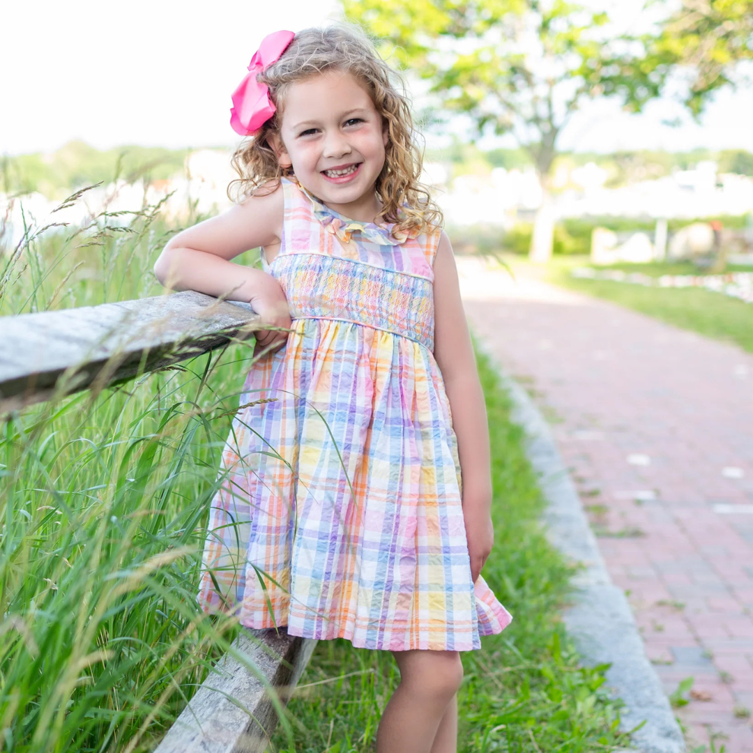 This lovely dress features beautiful pastel colors, smocking and a ruffled collar. It is perfect for sunny Spring and Summer days and for all Easter fun!