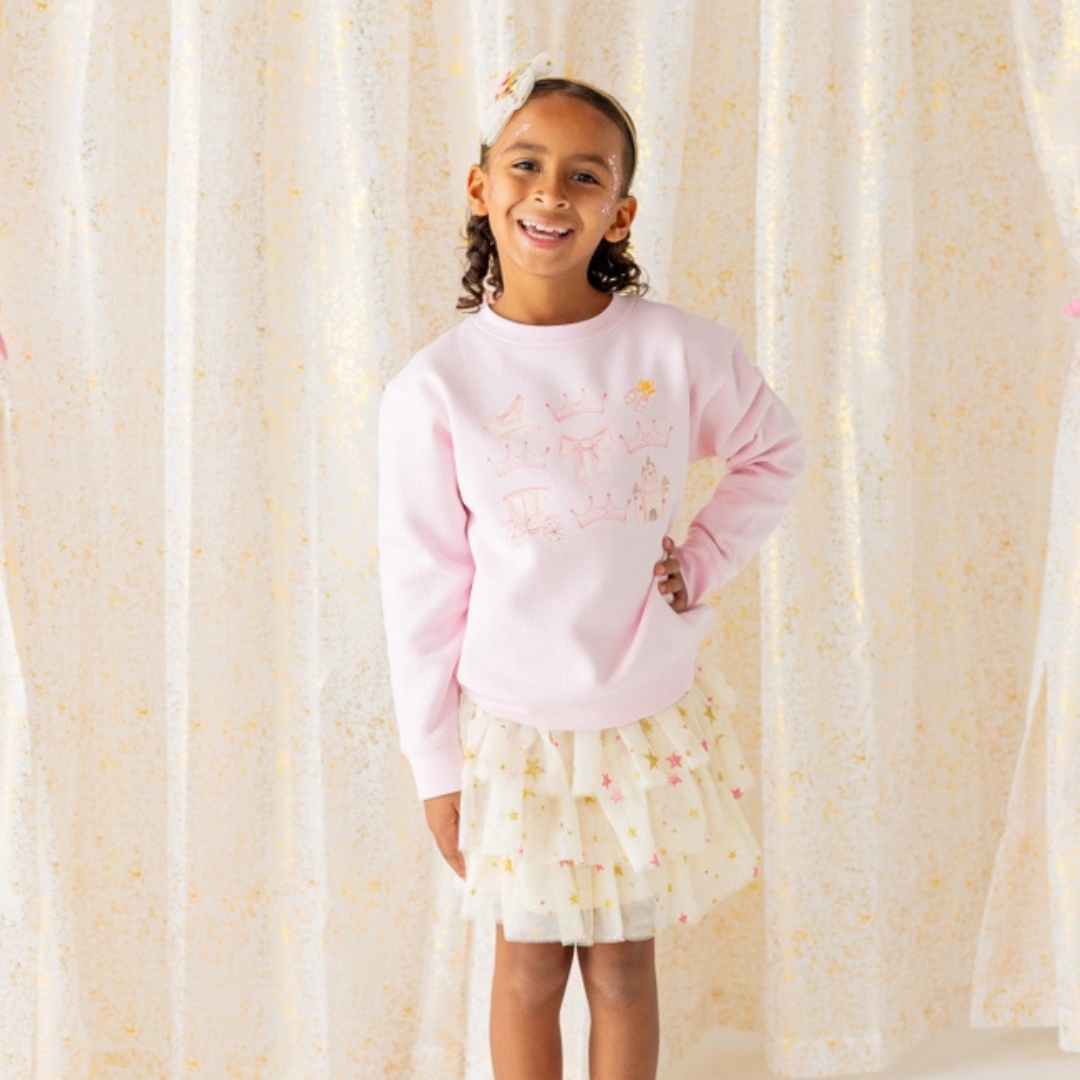Every little princess needs the perfect crown for every day wear...and this is it! This darling hair clip features an ivory tulle bow accented with gold and raspberry glitter stars and circles and a gold glitter crown motif, all of which sits on a ribbon-covered alligator clip. And for a truly adorable combination, pair the hair clip with the Magical Day Tiered Tutu!
