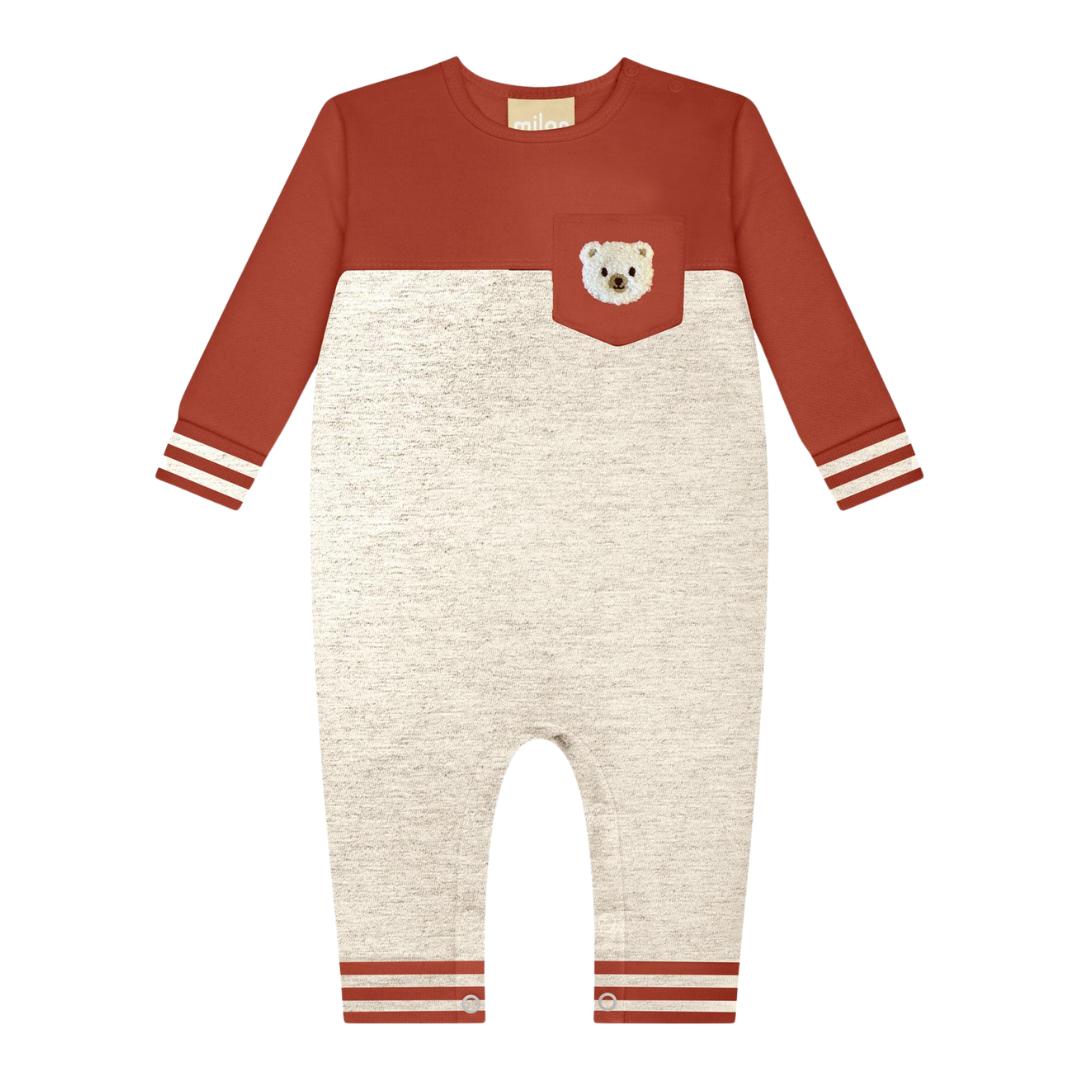 This jumpsuit is the ideal outfit for everyday activities! Featuring a fuzzy teddy bear face applique and a fun color combination of salmon and heather gray, your baby will be both comfortable and cozy in this darling jumpsuit!
